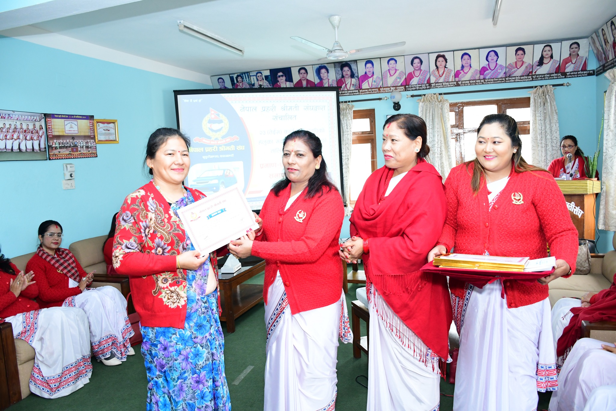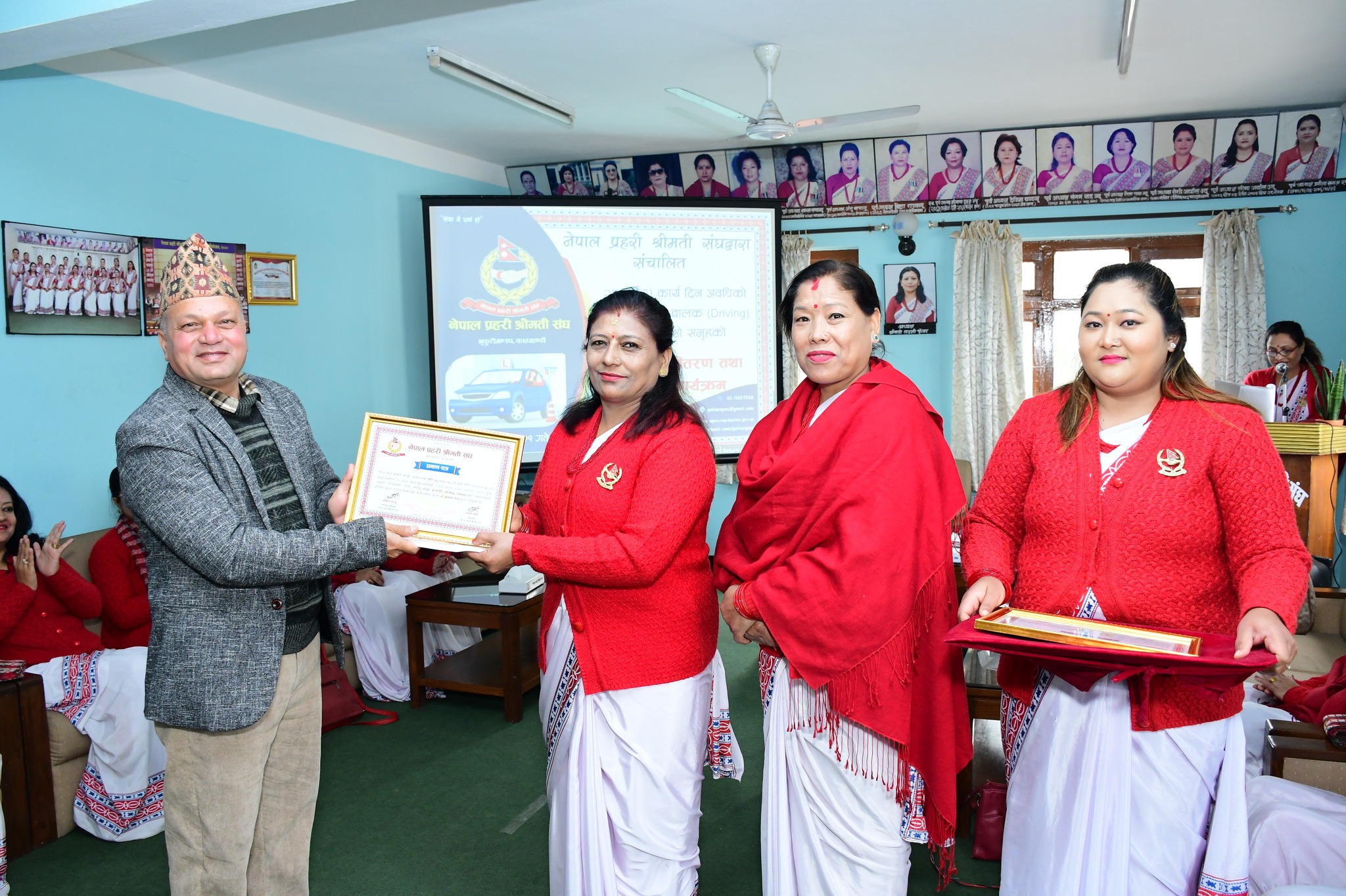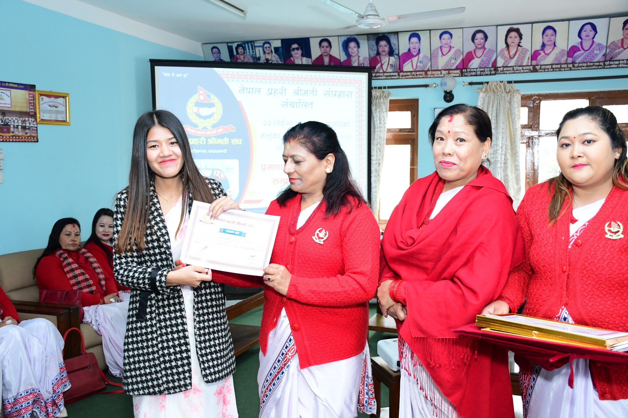 नेपाल प्रहरी श्रीमती संघका अध्यक्ष श्रीमती लक्ष्मी कुँवरज्यूको अध्यक्षतामा सम्पन्न भएको उक्त कार्यक्रममा संघका महासचिव श्रीमती अनुश्री पाख्रीनज्यू, कोषाध्यक्ष श्रीमती कल्पना गिरीज्यू, सचिव(प्रशासन) श्रीमती अनिता गुरुङज्यू, वरिष्ठ सल्लाहकार श्रीमती निलम कडायतज्यू, सह-कोषाध्यक्ष श्रीमती संगिता लम्सालज्यू, सह-सचिव (प्रशासन) श्रीमती चेतना चन्द शाहीज्यू, कार्यसमितिका पदाधिकारी श्रीमती राधिका ज्ञवालीज्यू, श्रीमती मन्जु पौडेलज्यू, श्रीमती मुना रेग्मीज्यू, श्रीमती कल्पना काफ्लेज्यू, श्रीमती अञ्जली तण्डुकारज्यू, श्रीमती अरिना राईज्यू, प्रहरी अधिकृतज्यू, तालिम प्रशिक्षकज्यूहरु, प्रशिक्षार्थीहरु तथा अन्य प्रहरी कर्मचारीहरु समेतको उपस्थिती रहेको थियो ।