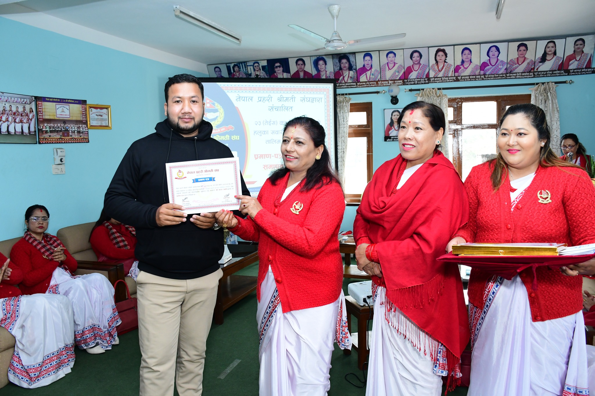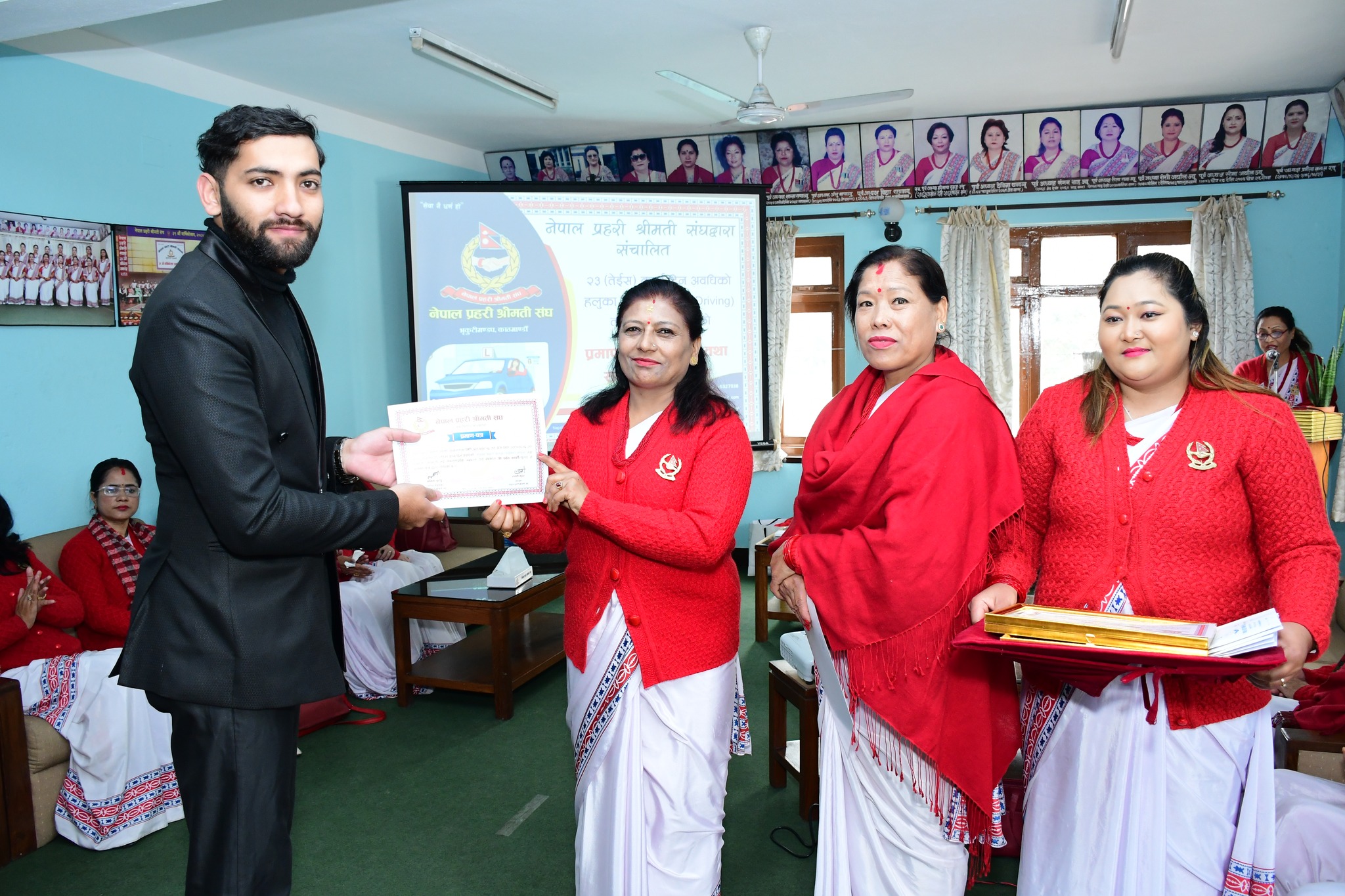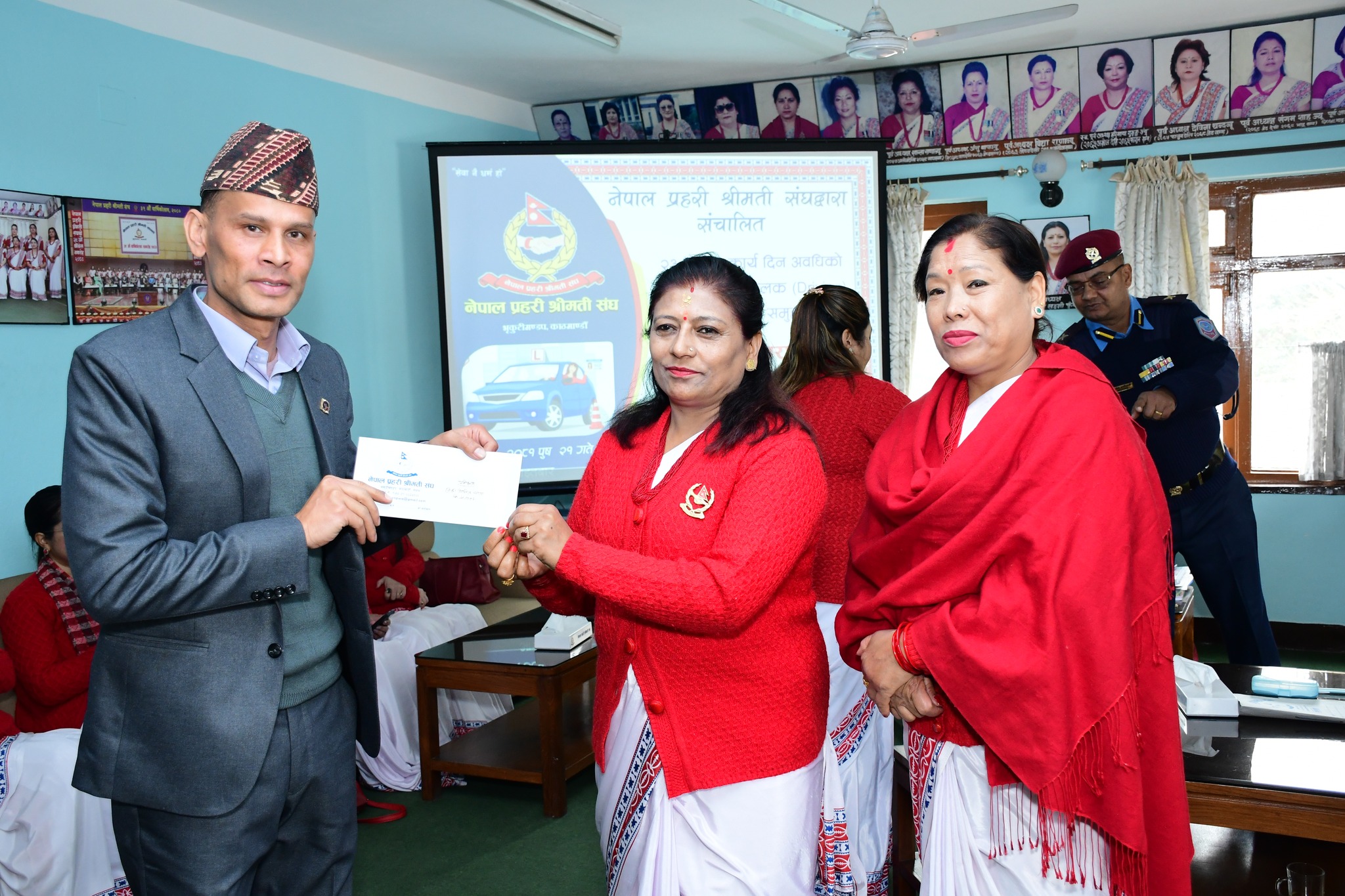 नेपाल प्रहरी श्रीमती संघका अध्यक्ष श्रीमती लक्ष्मी कुँवरज्यूको अध्यक्षतामा सम्पन्न भएको उक्त कार्यक्रममा संघका महासचिव श्रीमती अनुश्री पाख्रीनज्यू, कोषाध्यक्ष श्रीमती कल्पना गिरीज्यू, सचिव(प्रशासन) श्रीमती अनिता गुरुङज्यू, वरिष्ठ सल्लाहकार श्रीमती निलम कडायतज्यू, सह-कोषाध्यक्ष श्रीमती संगिता लम्सालज्यू, सह-सचिव (प्रशासन) श्रीमती चेतना चन्द शाहीज्यू, कार्यसमितिका पदाधिकारी श्रीमती राधिका ज्ञवालीज्यू, श्रीमती मन्जु पौडेलज्यू, श्रीमती मुना रेग्मीज्यू, श्रीमती कल्पना काफ्लेज्यू, श्रीमती अञ्जली तण्डुकारज्यू, श्रीमती अरिना राईज्यू, प्रहरी अधिकृतज्यू, तालिम प्रशिक्षकज्यूहरु, प्रशिक्षार्थीहरु तथा अन्य प्रहरी कर्मचारीहरु समेतको उपस्थिती रहेको थियो ।