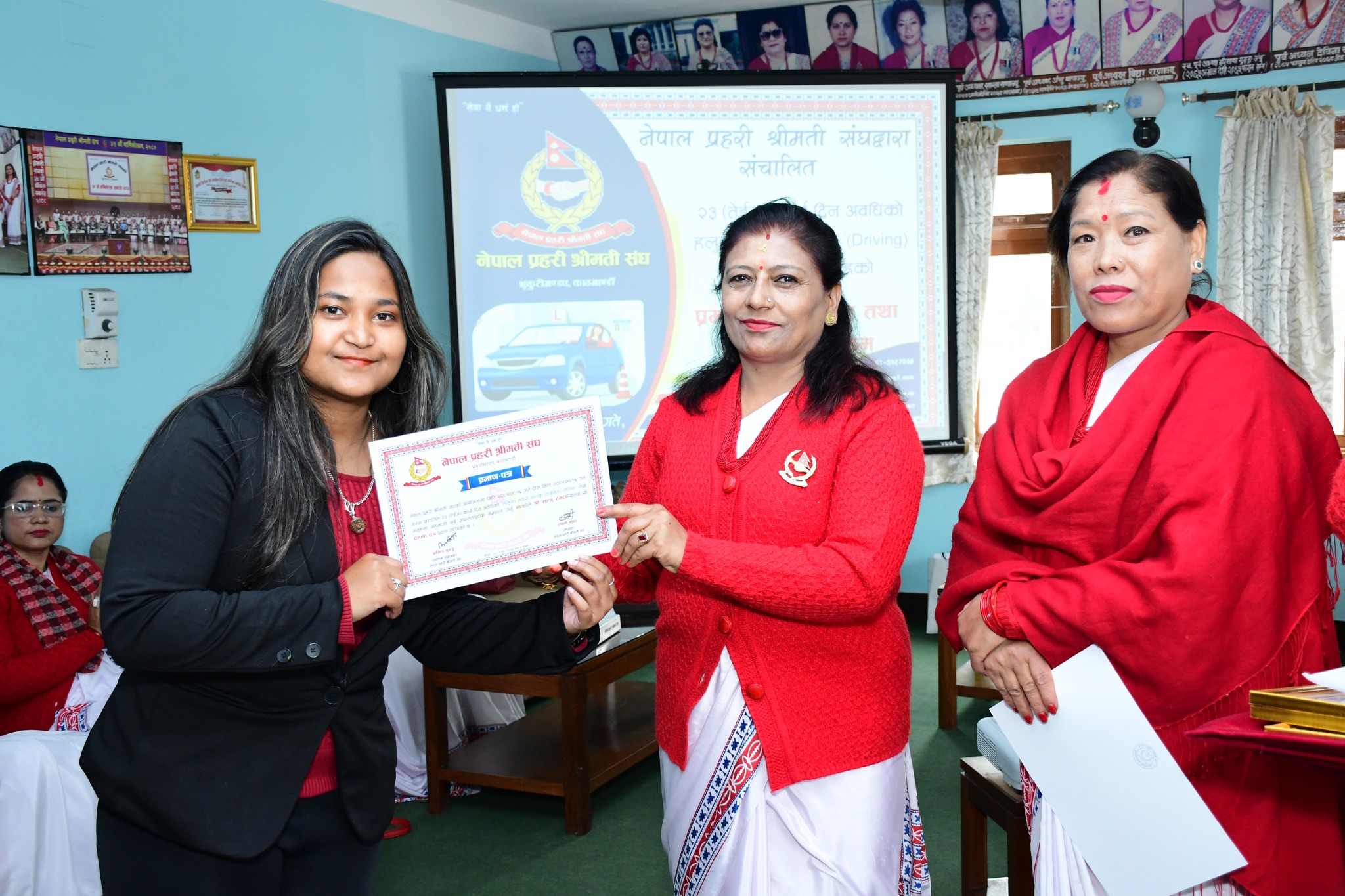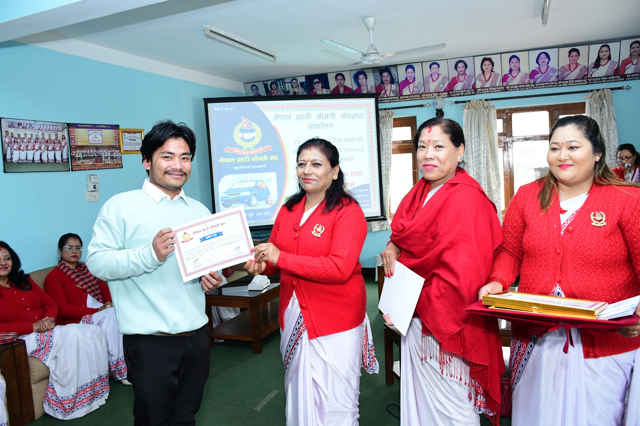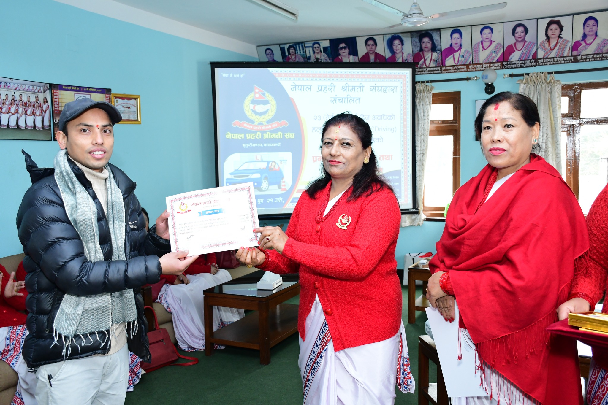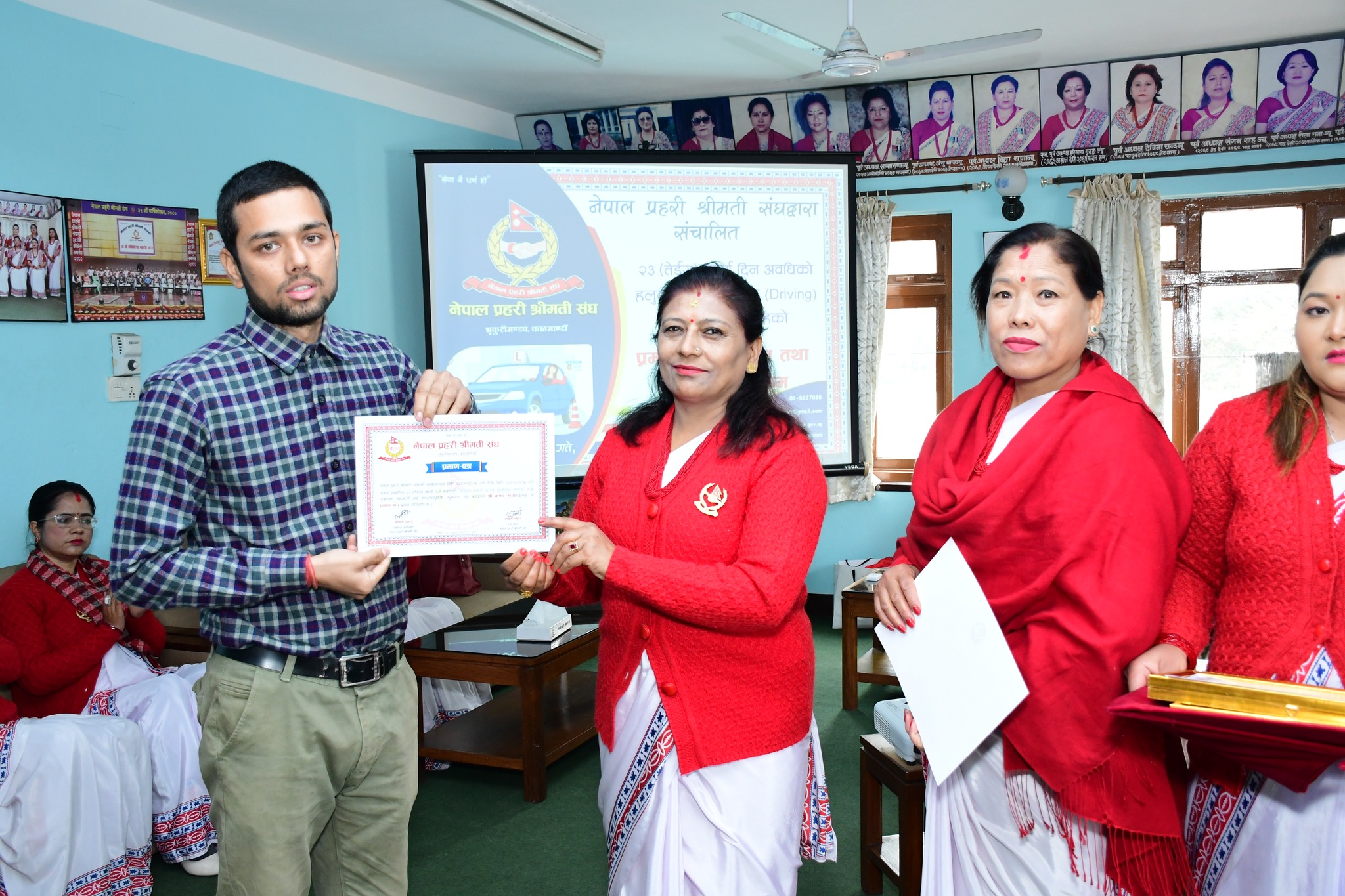 यस नेपाल प्रहरी श्रीमती संघ भृकुटीमण्डप काठमाडौको आयोजनामा सञ्चालित २३ कार्य दिन अवधिको हलुका सवारी चालक (Driving) तालिम सम्पन्न भएको छ ।