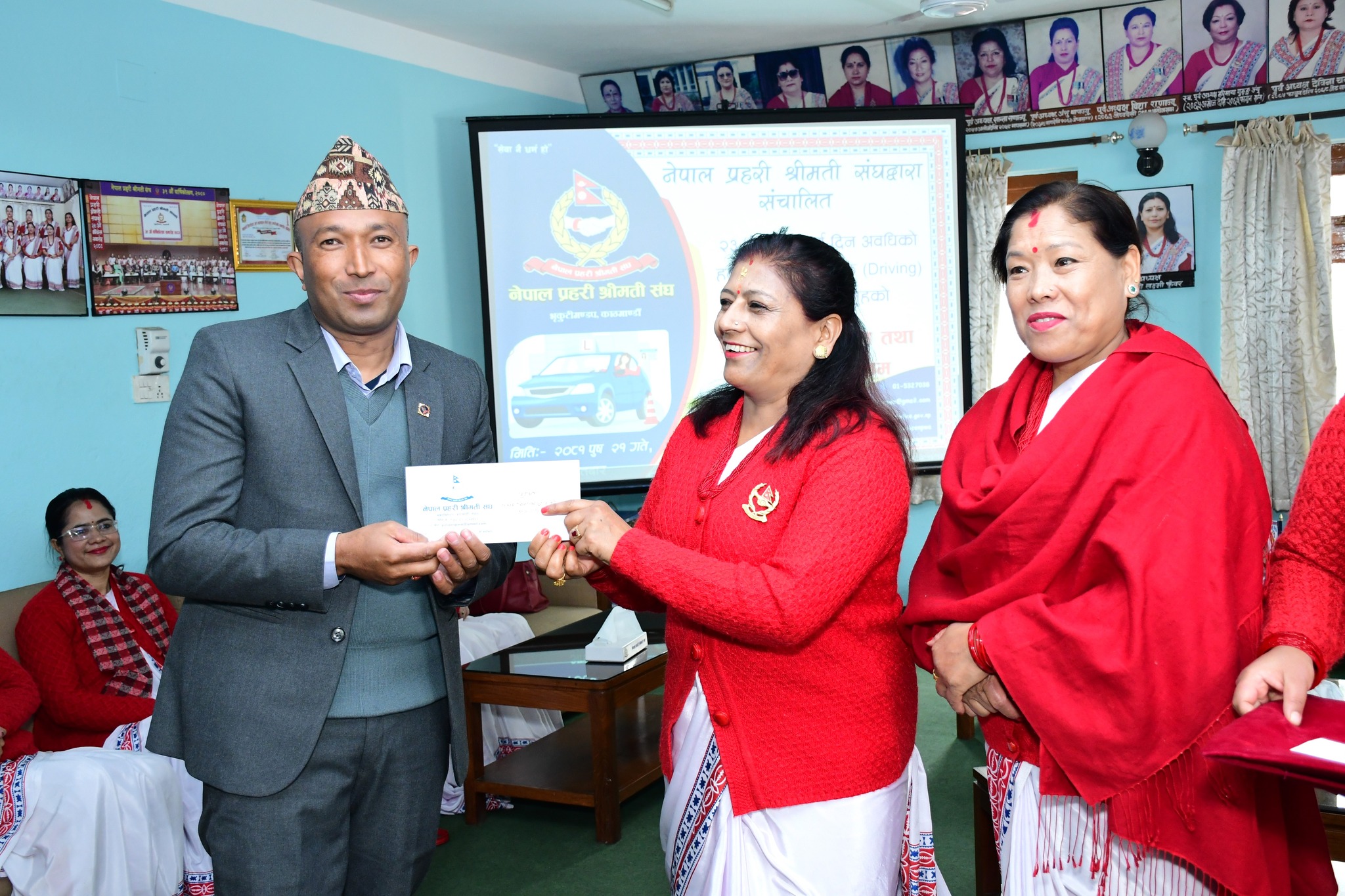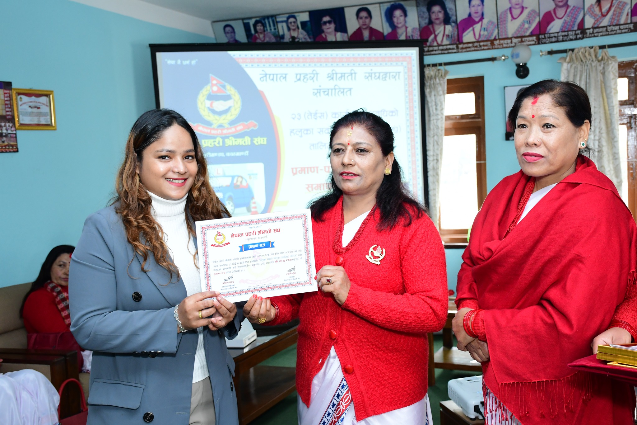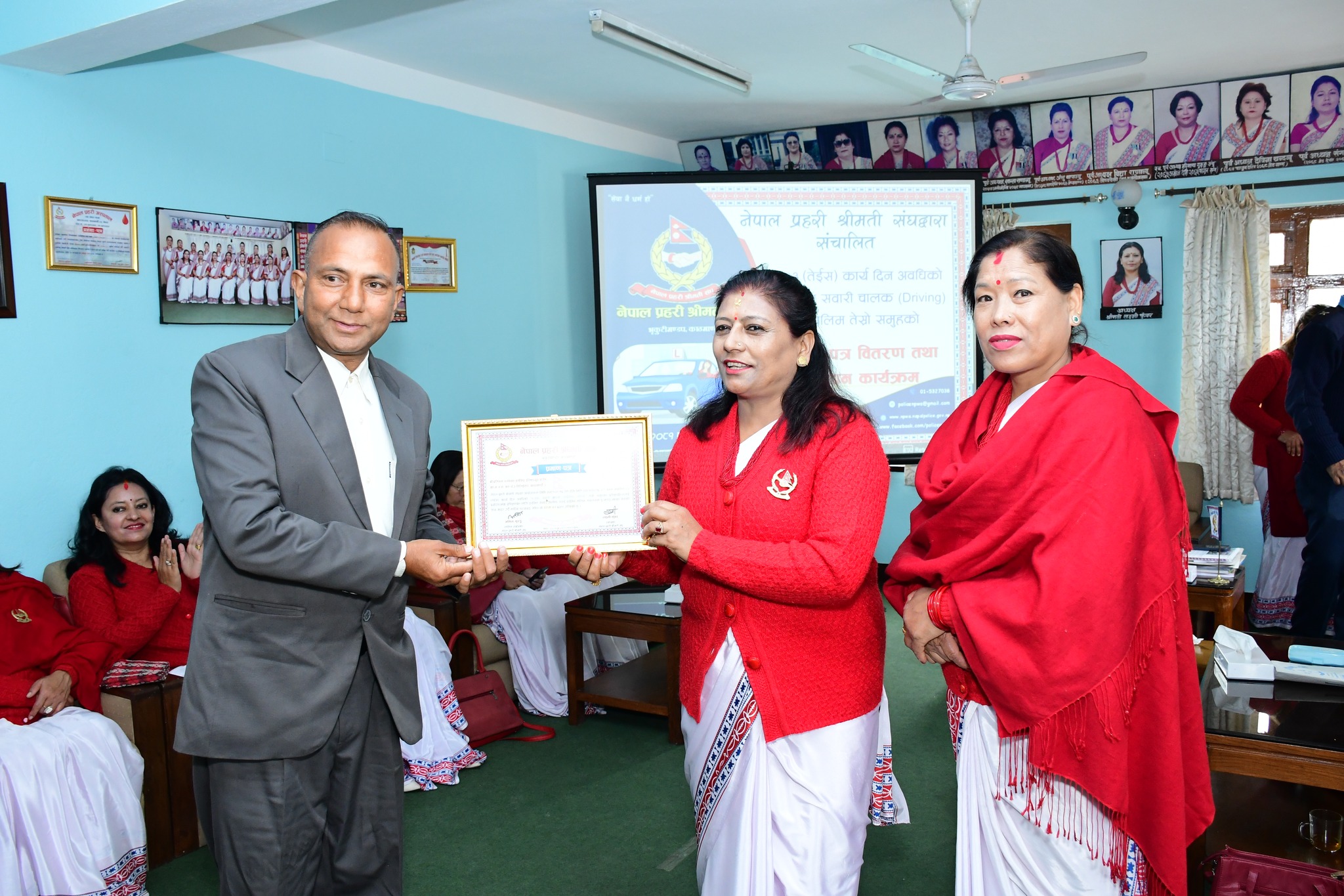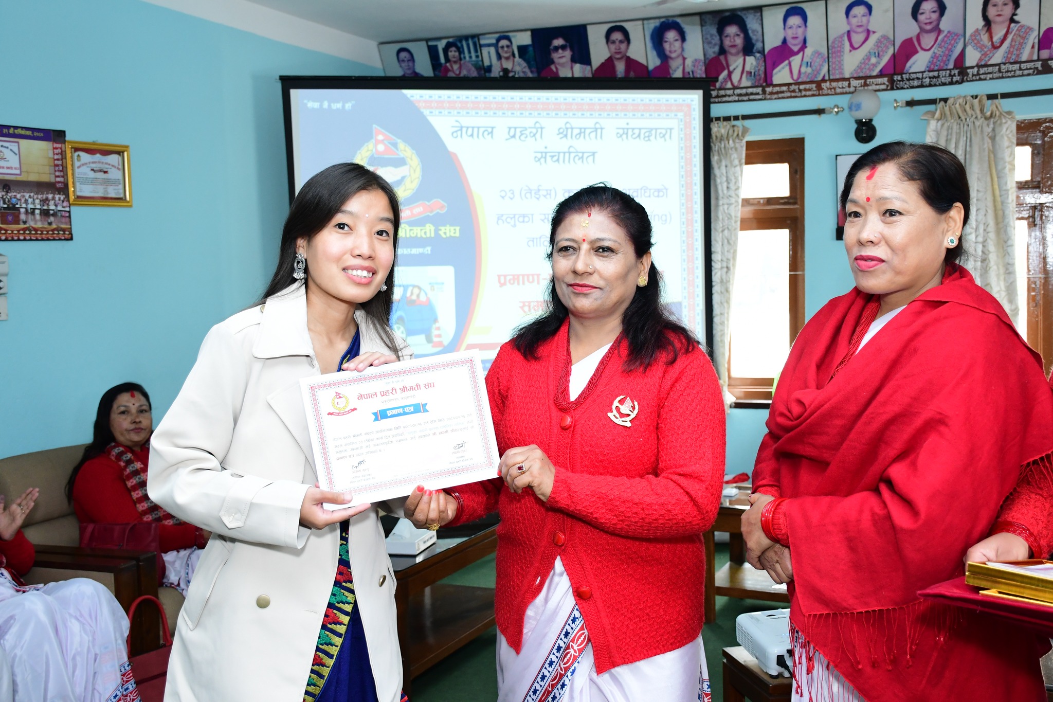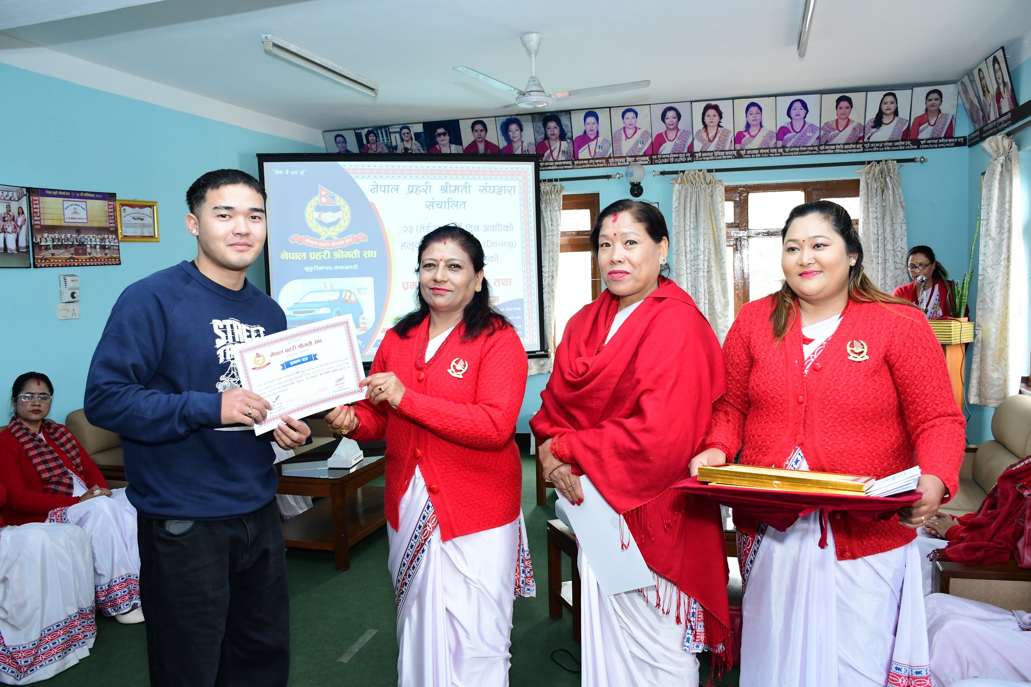 यस नेपाल प्रहरी श्रीमती संघ भृकुटीमण्डप काठमाडौको आयोजनामा सञ्चालित २३ कार्य दिन अवधिको हलुका सवारी चालक (Driving) तालिम सम्पन्न भएको छ ।