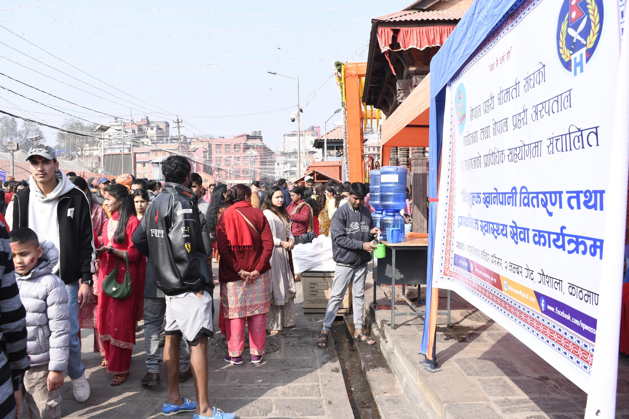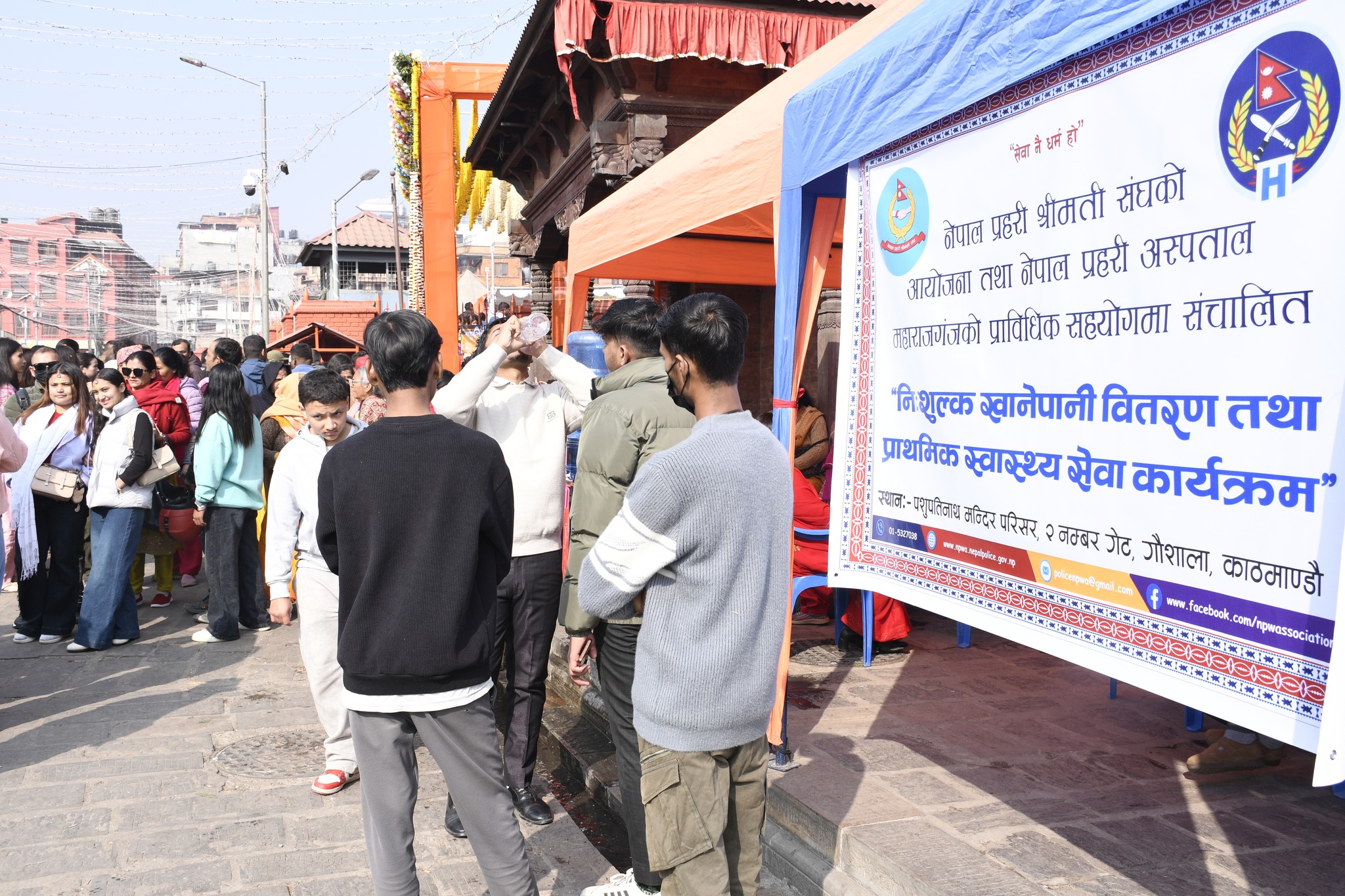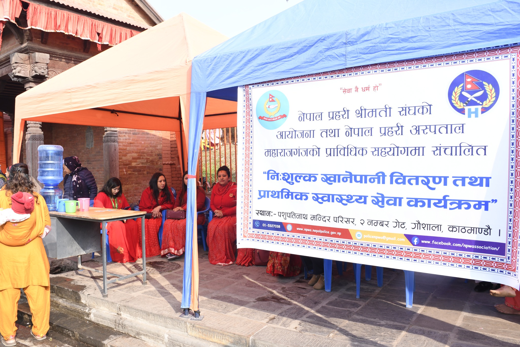 महाशिवरात्रीको अवसरमा नेपाल प्रहरी श्रीमती संघ भृकुटीमण्डप, काठमाडौंको आयोजना तथा नेपाल प्रहरी अस्पताल महाराजगंजको सहकार्यमा पवित्र धार्मिक स्थल पशुपतिनाथ मन्दिर दर्शन गर्न आउने श्रद्धालु भक्तजनहरुलाई लक्षित गरि प्रथामिक स्वास्थ्य उपचार,शुद्ध पिउने पानी तथा भक्तजनहरुको सुरक्षार्थमा खटिएका प्रहरी कर्मचारीहरुलाई खाजा शिविर कार्यक्रम सम्पन्नः